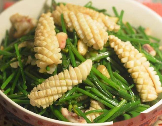 - 特点:鱿鱼花卷曲美观,韭菜花清香可口,是一道色香味俱佳的海鲜菜。