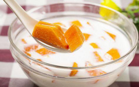 食材:鸡蛋2个、牛奶1袋、木瓜适量、白糖适量; 做法: 1.木瓜切丁备用。 2.将150毫升的牛奶加适量的糖,放微波炉加温,不需要沸腾。稍凉再用。 3. 取两个鸡蛋的蛋清,搅打均匀,和温牛奶混合。 4.把木瓜粒和一半牛奶、鸡蛋清混合液放在空碗里。隔水蒸5分钟。 5.再倒入剩下的混合液,蒸至凝固。表面放几颗木瓜装饰。 川贝冰糖雪梨