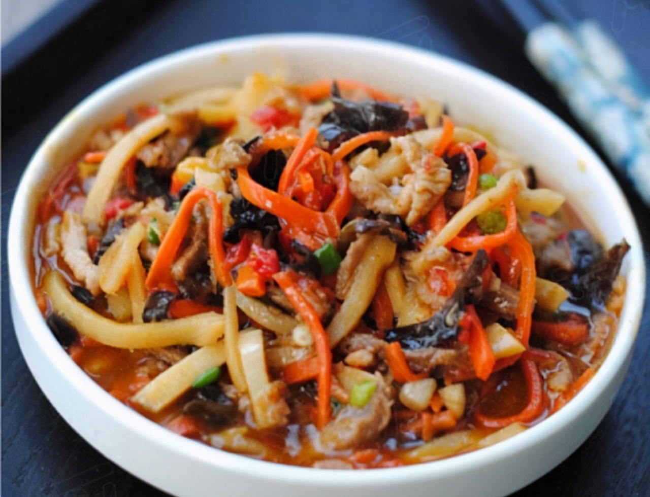 【食材】猪瘦肉、冬笋、黑木耳、胡萝卜、自制剁椒、肉汤、盐、糖、醋、生抽、淀粉、葱蒜姜各适量 【做法】1、将将泡发的黑木耳切丝,玉兰片切丝,猪瘦肉切丝,葱姜蒜切末。 2、将肉丝用少许盐、料酒和淀粉将肉丝稍腌;并将淀粉、盐、白糖、醋、生抽、肉汤(或水)兑成调味汁。 3、热锅下冷油,油温热后,下肉丝迅速划炒散开;炒至肉色变白后用铲子将肉丝拨在锅边(或盛出),底油加自制剁椒、蒜末、姜末炒香;将肉丝翻炒均匀。 4、加入绰水后的胡萝卜丝煸炒1分钟左右;然后下入玉兰丝和黑木耳丝大火煸炒片刻;倒入芡汁,待汤汁粘稠时加葱花翻炒均匀即可。 牛肉块炖土豆