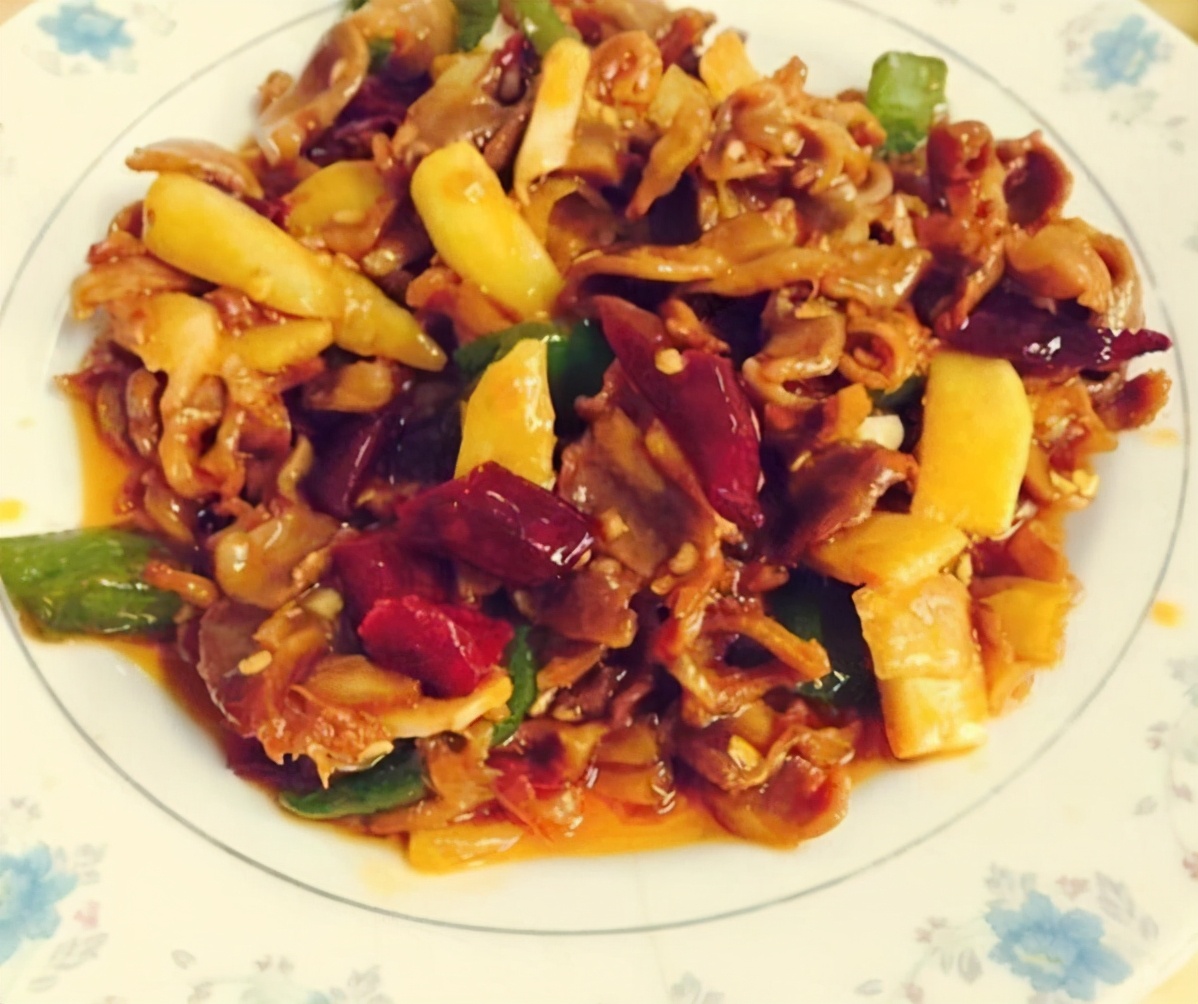 材料:鸡胗、野山椒、泡椒、大葱、油、盐、姜片、青椒; 做法 1.鸡胗切片用刀在鸡胗片上划十字,切好后用料酒白胡椒腌制一会会,然后在沸水里煮至变色后马上捞出。野山椒、泡椒、大葱切小段,姜片也切好,还有青椒有切好。 2.热锅热油,放入大葱、野山椒、泡椒、姜片大火炒香,尽量多炒一会把泡椒里面的味道逼出来, 3.锅中倒入青椒翻炒30秒,即可 干锅手撕包菜