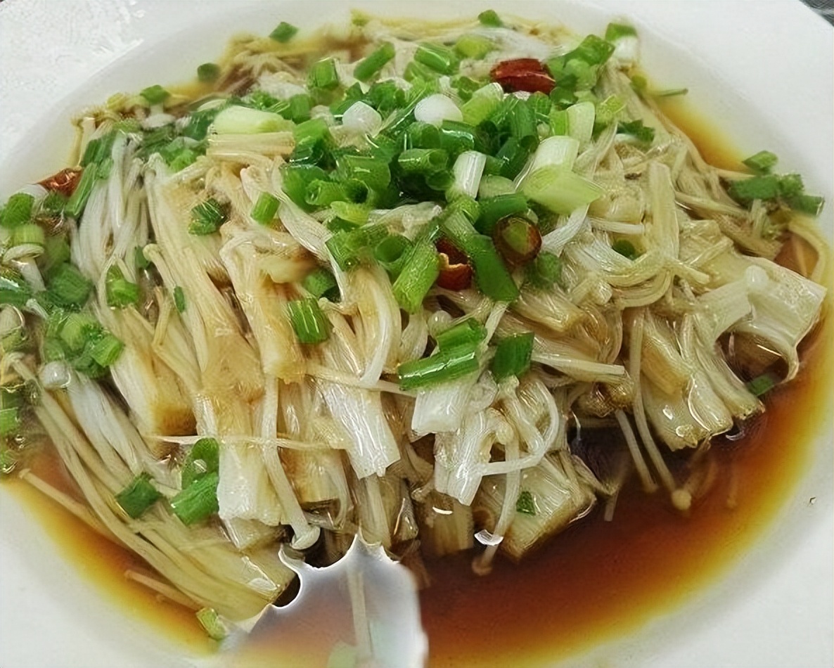 食材:金针菇400克、小葱2棵、干辣椒1个、植物油适量-、食盐1小勺、生抽1小勺、 香油数滴、醋1小勺; 做法: 1、金针菇切去根部洗干净,葱切花、干椒切小段;洗干净的金针菇放入开水锅中焯烫一下过凉水 2、小碗中放入切好的葱花和干椒段,将烧热的植物油和香油浇上去,另外将生抽、醋和少许盐调成味凉拌汁 3、沥干水的金针菇放入碗底,分别浇上葱油和凉拌汁,拌匀即可 羊血豆腐