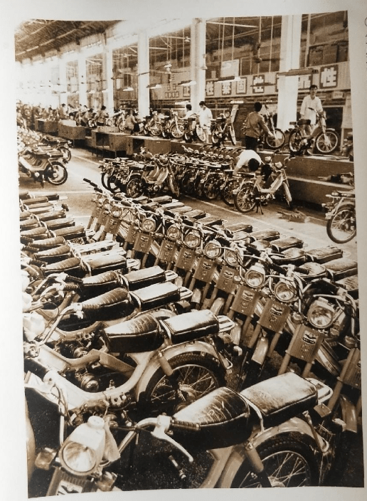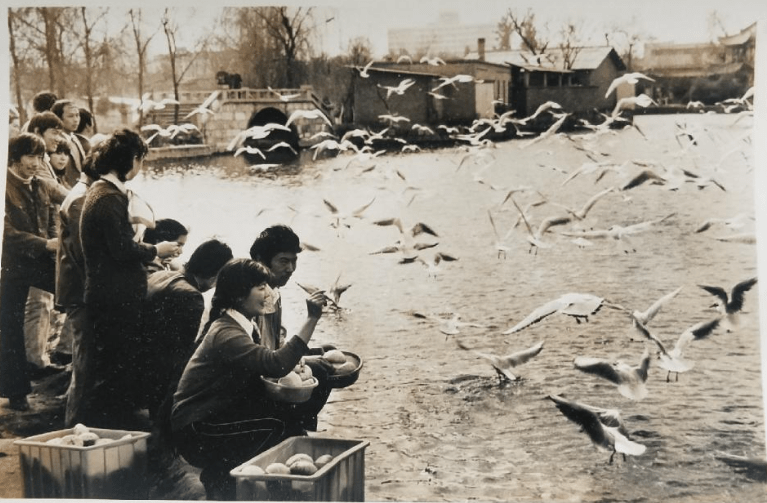 在这张照片中,我们看到了一群昆明市民与红嘴鸥亲密互动的场景。从1980年代开始,成群的红嘴鸥每年都会飞到昆明,过冬。昆明的温暖气候和美丽的湖泊成为了这些小鸟的理想栖息地。每到红嘴鸥飞来的季节,昆明市民们都会在观鸥点聚集,欣赏这些美丽的鸟儿,享受与自然亲近的时光。 下一张照片是重庆嘉陵经济联合体摩托车生产线的宣传照。自1980年成立以来,嘉陵经济联合体通过不断创新和发展,五年内便向市场推出了超过66万辆摩托车,成为当时中国摩托车工业的领军企业之一。照片反映了中国工业化进程中的重要一环,也代表了那个时代经济发展的蓬勃气象。