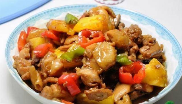 2.锅内入熟猪油,烧至五成热时,加入姜片、蒜子爆香,倒入鸡块,炒至金黄,加开水100克、菠萝汁200克、盐、味精、小火焖制5分钟,倒入小尖椒、美人椒翻炒,出锅装盘即可。