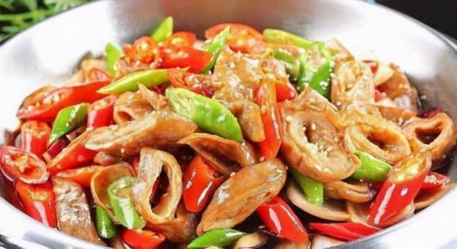 5.锅内入油,爆香辣椒、姜、蒜,倒入肥肠,翻炒,加入少许料酒,生抽,盐,一点点糖,翻炒到辣椒有香味,即可出锅。