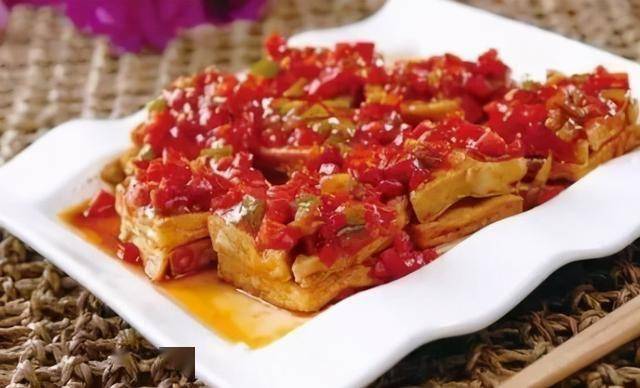 2、将炖干整齐地码放在梅菜酱上面,剁椒放在炖干上,旺火蒸10分钟。3、葱油烧至八成热,浇在热菜上即可。