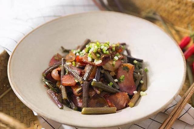 做法:1、将腊肉切片,蕨菜洗净切段。
