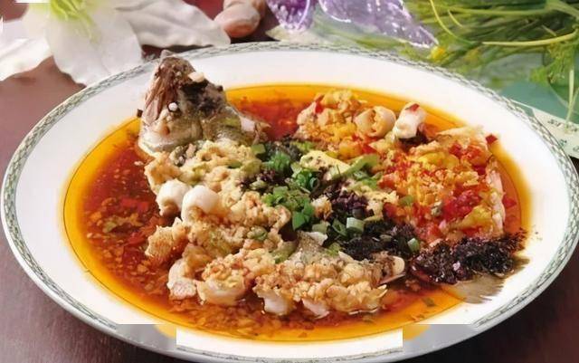 3、把鱼放在盘子上,将熟蒜茸、剁椒、泡椒分别抹在一侧的鱼肉上,将豉汁抹在鱼背上,入蒸箱蒸熟,取出撒葱花,浇热油,淋入虾抽即成