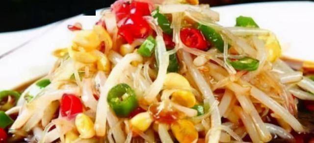 食材:粉丝1束,油炸花生米(去衣)、香菜叶各少许,红椒,野山椒、豆芽,辣椒油、陈醋、食盐、麻油各适量。
