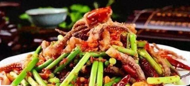 3、另起锅,加油烧热,下花椒、干辣椒丝、蒜片以及适量的料酒、盐爆香后,将芹菜和炸至六七成熟的鱿鱼一并下锅翻炒;待芹菜脱生后即可关火,同时加入孜然粒、香酥椒、味精搅拌均匀即可。