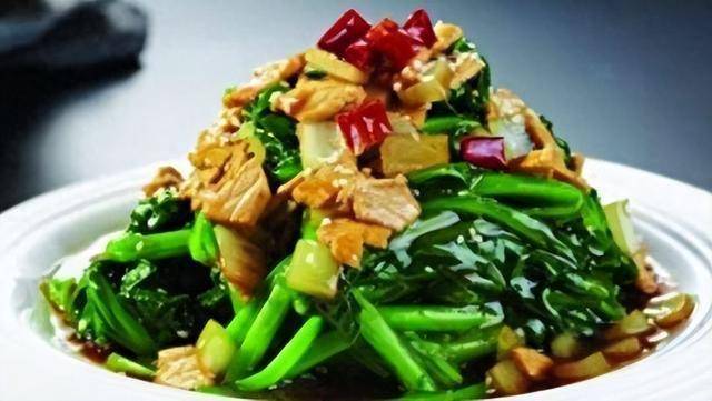12、调入花椒粉,放蒜苗叶,炒匀,即可.