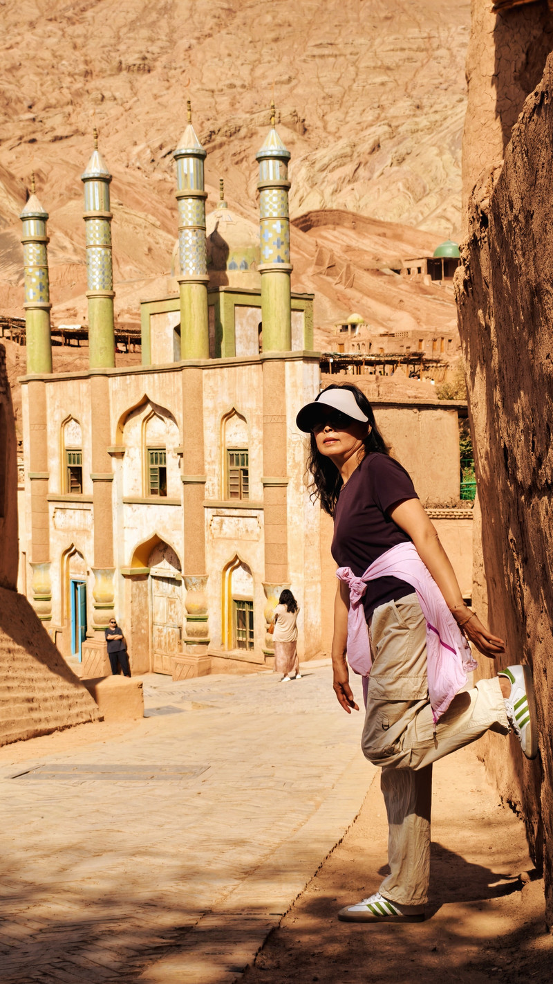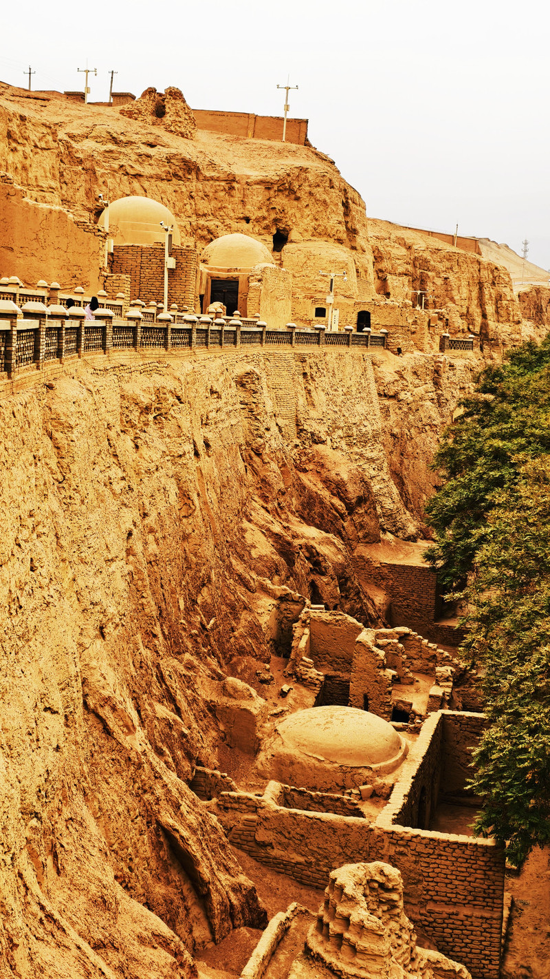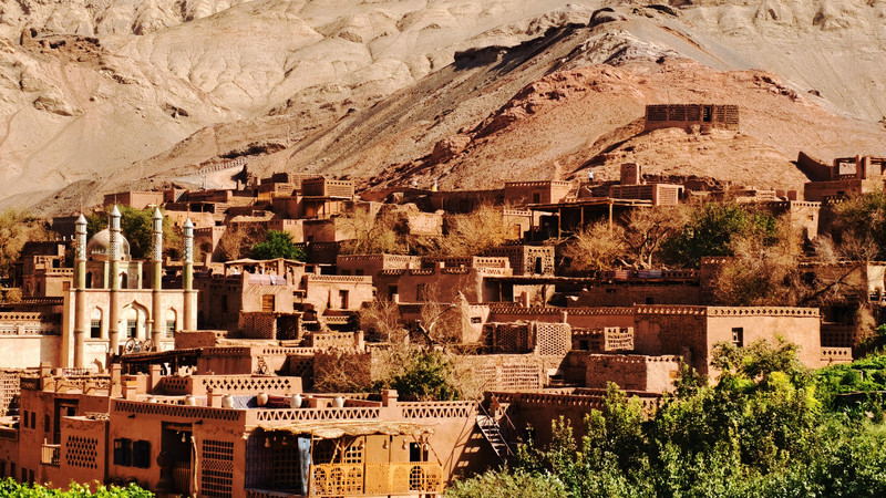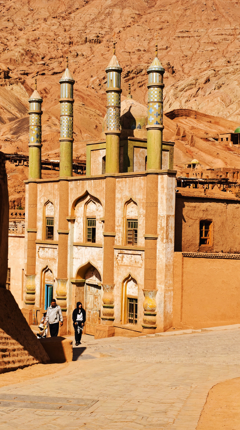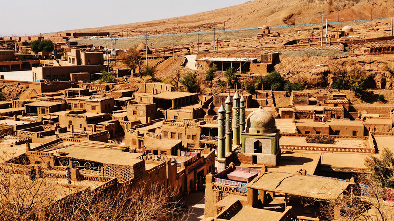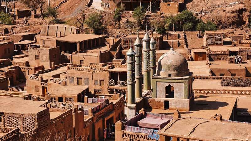 吐峪沟麻扎村:火焰山峡谷中的生土古村落,伊斯兰圣地与佛窟共存,黄昏时登上霍加木墓俯瞰赤壁中的蓝绿色清真寺圆顶。
