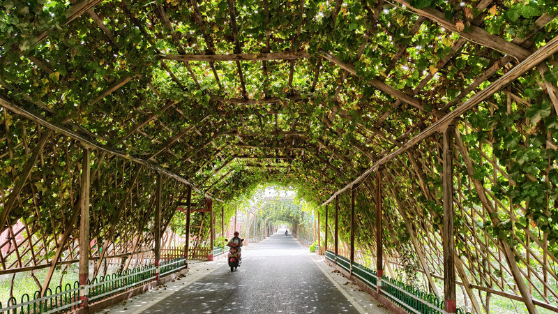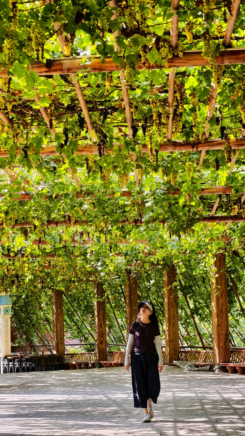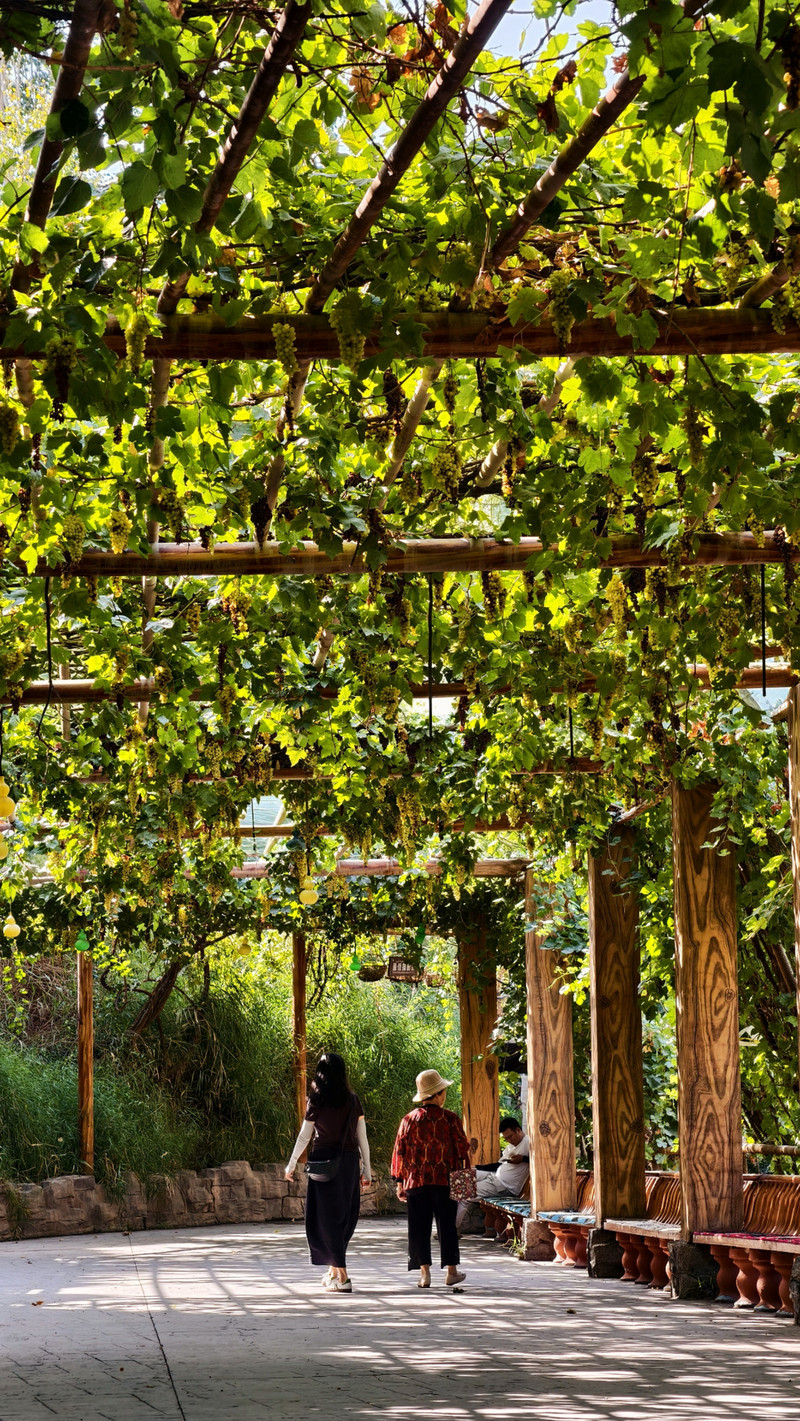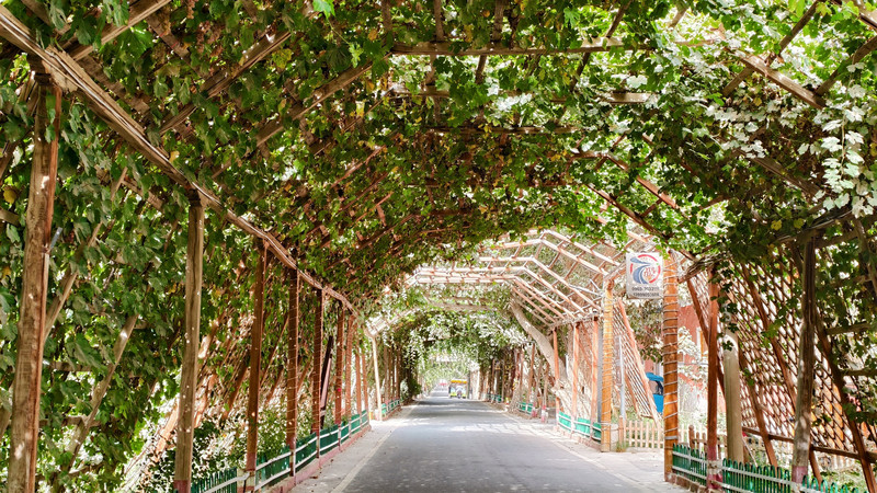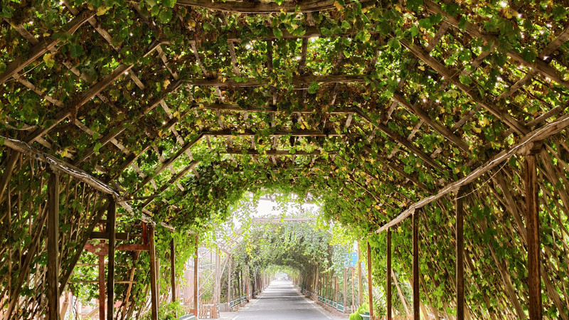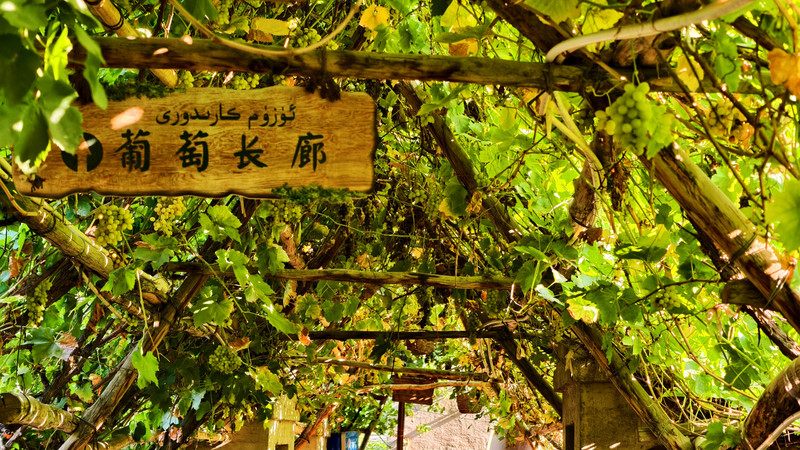 葡萄沟夜宴:钻进阿娜尔罕家的百年葡萄架,就着木炭馕坑肉,品尝“玫瑰香”“马奶子”现摘葡萄,聆听十二木卡姆即兴弹唱。