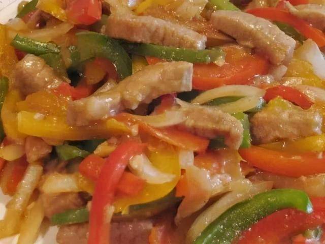 食材:青红椒、酱油、香油、黑胡椒汁、牛肉500克