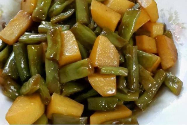 土豆、茄子、青椒分别过油(可用空气炸锅替代),再合炒调味。传统东北菜,蔬菜经油润后更显醇厚。