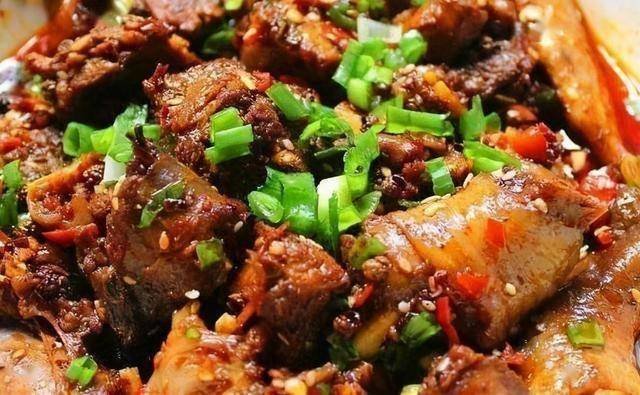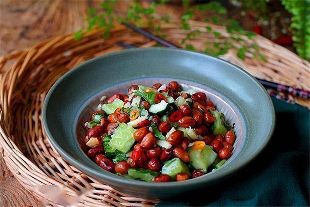 鸡胸肉切丁腌制,与花生、干辣椒、葱段同炒,用酱油、醋、糖调汁。酸甜微辣,促进消化。