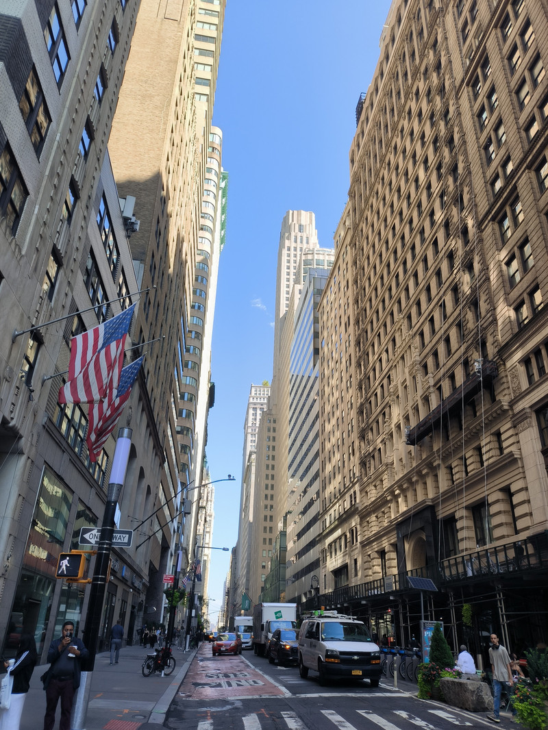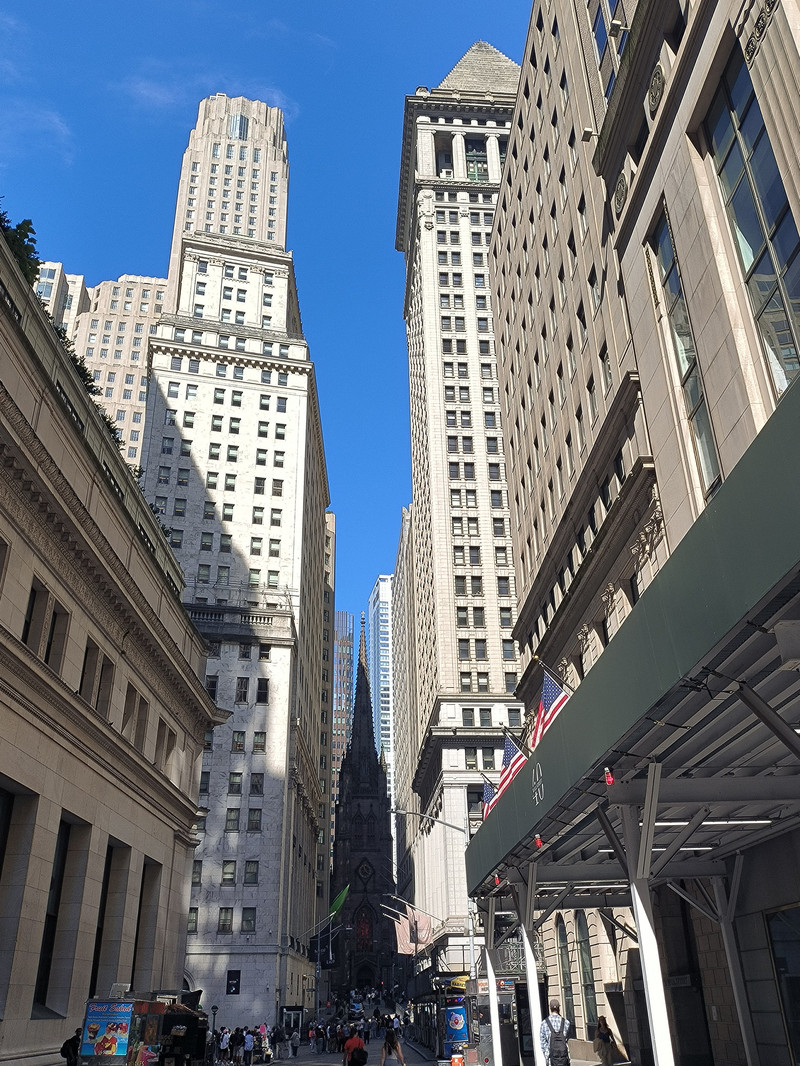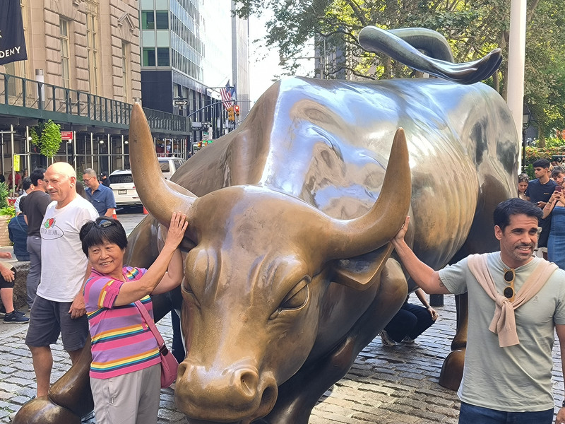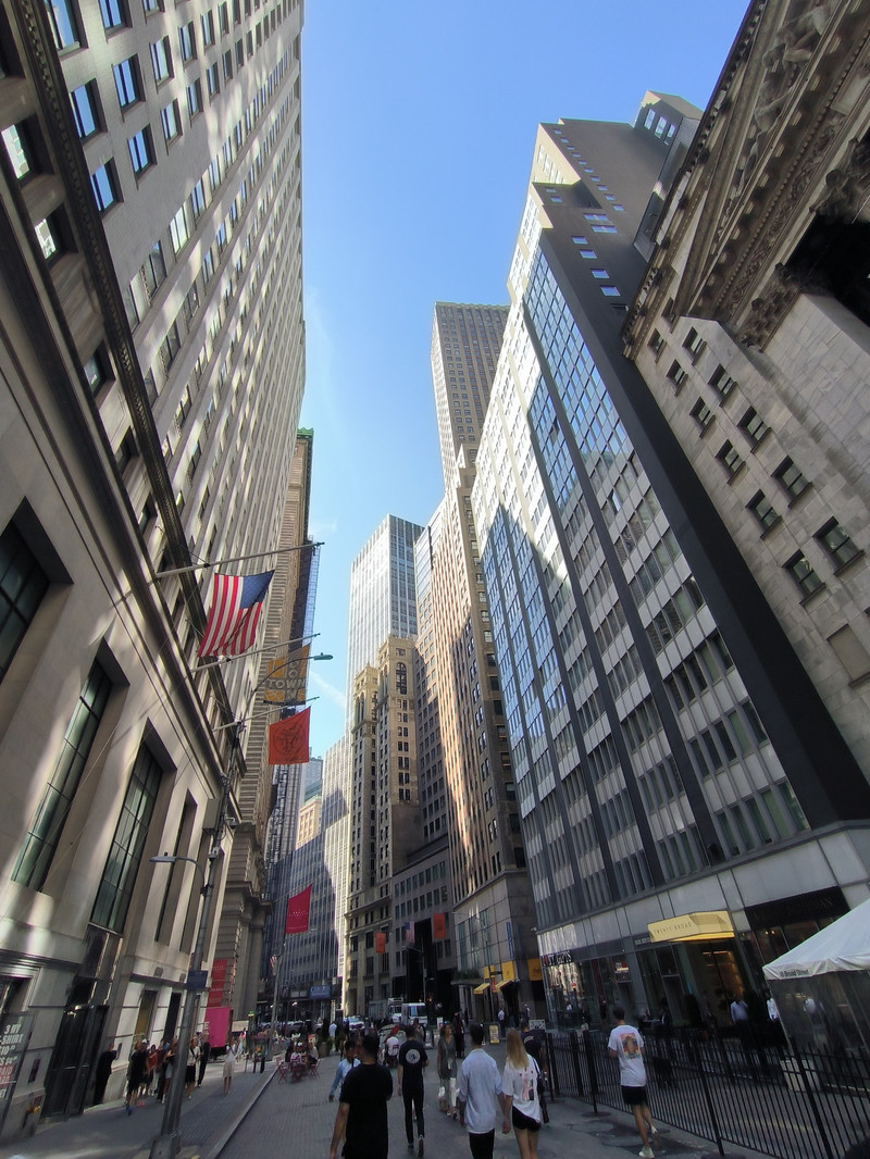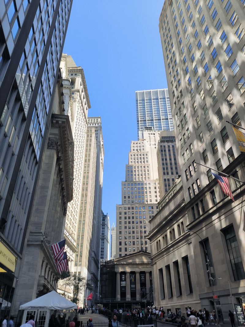 下船后前往曼哈顿岛南部的华尔街,此街起源于17世纪,最初只是一条狭窄的街道,1653年荷兰人在这里修建了一堵土墙,墙壁的英文为 Wall,音译为华尔,此街由此得名。华尔街狭窄而短,宽仅11米,长度540米,却以美国的金融中心闻名于世,摩根财团、洛克菲勒石油大王、高盛集团和杜邦财团开设的银行、保险、航运、铁路公司均集中于此,这里还有一座特朗普大厦,但街上最著名的建筑物是位于百老汇街口的联邦国家纪念堂