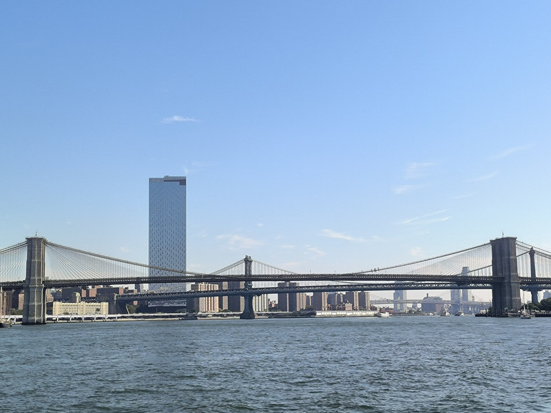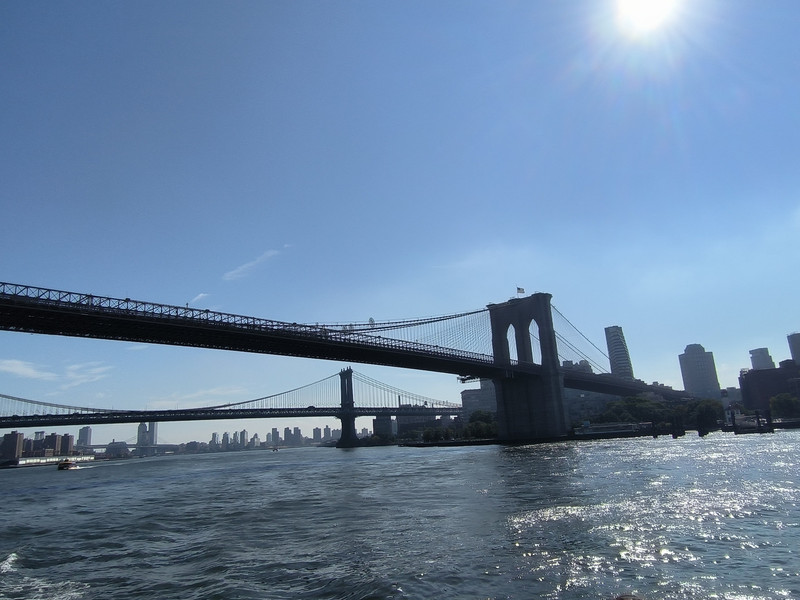 上午我们首先来到曼哈顿岛南端的码头,乘船向北穿过布鲁克林大桥,此桥为横跨东河的悬索桥,桥面采用钢材建造,历时14年建成于1883年,是连接曼哈顿和布鲁克林区三桥中最老的一座,1964年成为美国国家历史地标,其跨度约486米,桥墩高87米,桥身距离水面41米,每天从桥上经过的车辆多达14万辆。