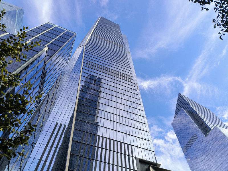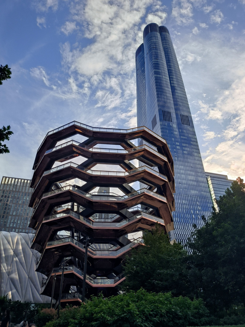 接下来我们前往哈德逊广场,这是曼哈顿最后开发的区域,耗资高达250亿美元,是纽约最大的开发项目,也是美国历史上最大的私人房地产项目,包含住宅楼、办公室、广场、购物中心和餐厅等功能设施,广场中央是一座松果型的古铜色异型建筑,高330米共16层,呈圆形环绕,由英国设计师托马斯·赫斯维克设计,因其蜂窝状螺旋楼梯结构形似“巨型松果”而闻名,是哈德逊广场的标志性建筑,周围全是新建的摩登大楼。