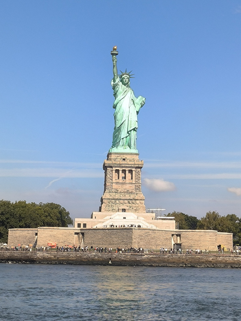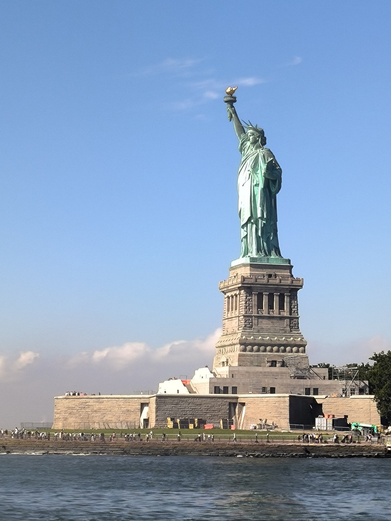 最后我们来到哈德逊河口的自由岛,远观岛上的自由女神像,此像建成于1886年,是法国为纪念美国独立战争胜利100周年而建,塑像为青铜质,高达46米,总重量达225吨,立于高45米的底座上,内部中空可登至头顶,1984年列入世界遗产名录,其全名为“自由女神铜像国家纪念碑”,正式名称是“照耀世界的自由女神”。