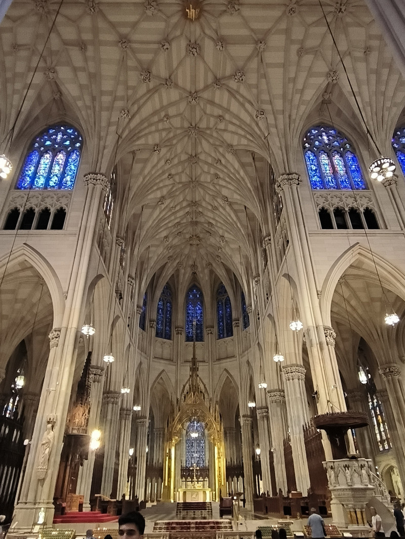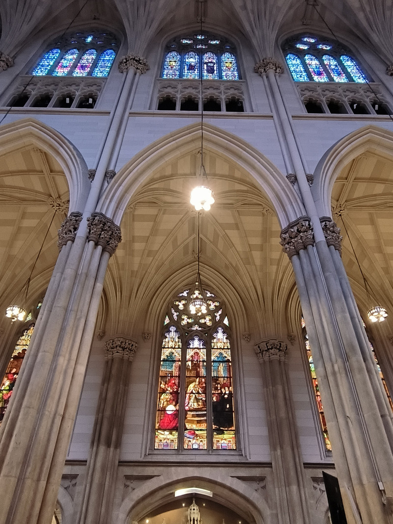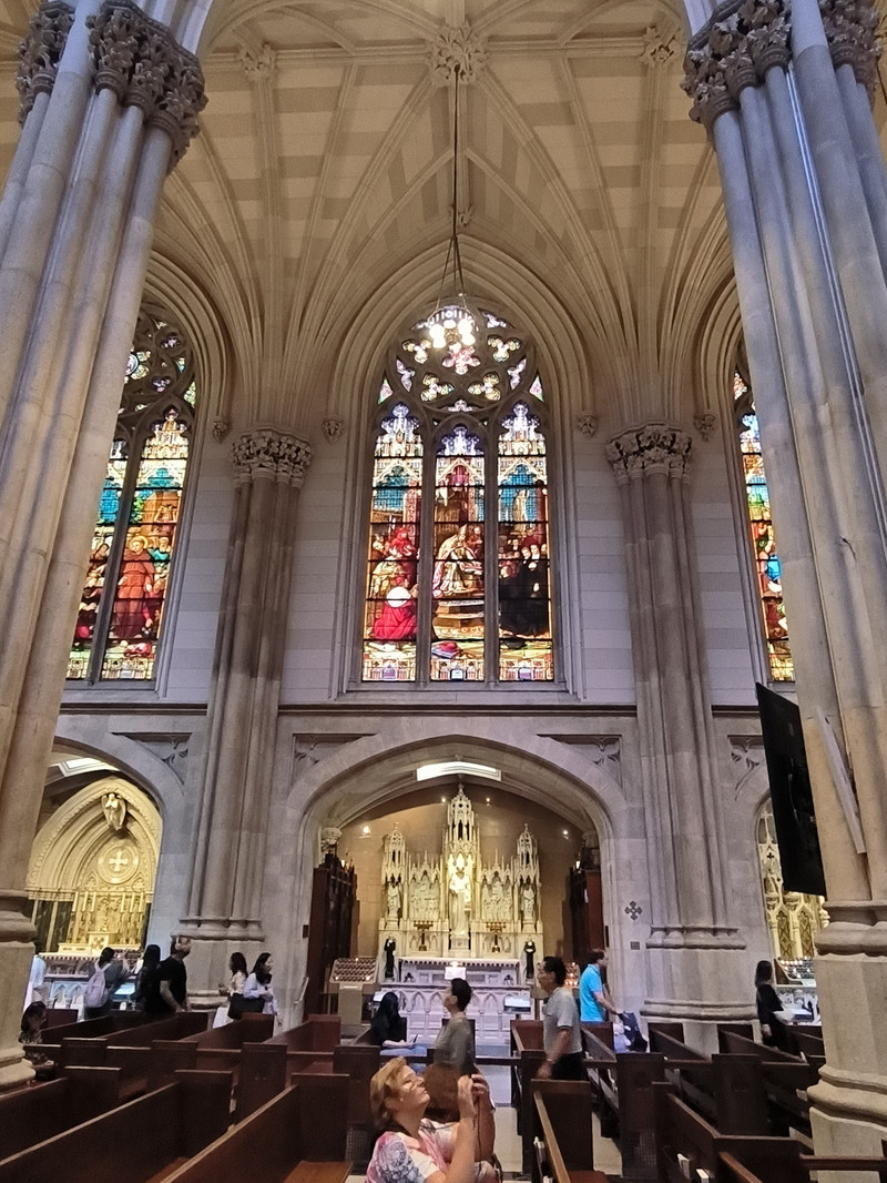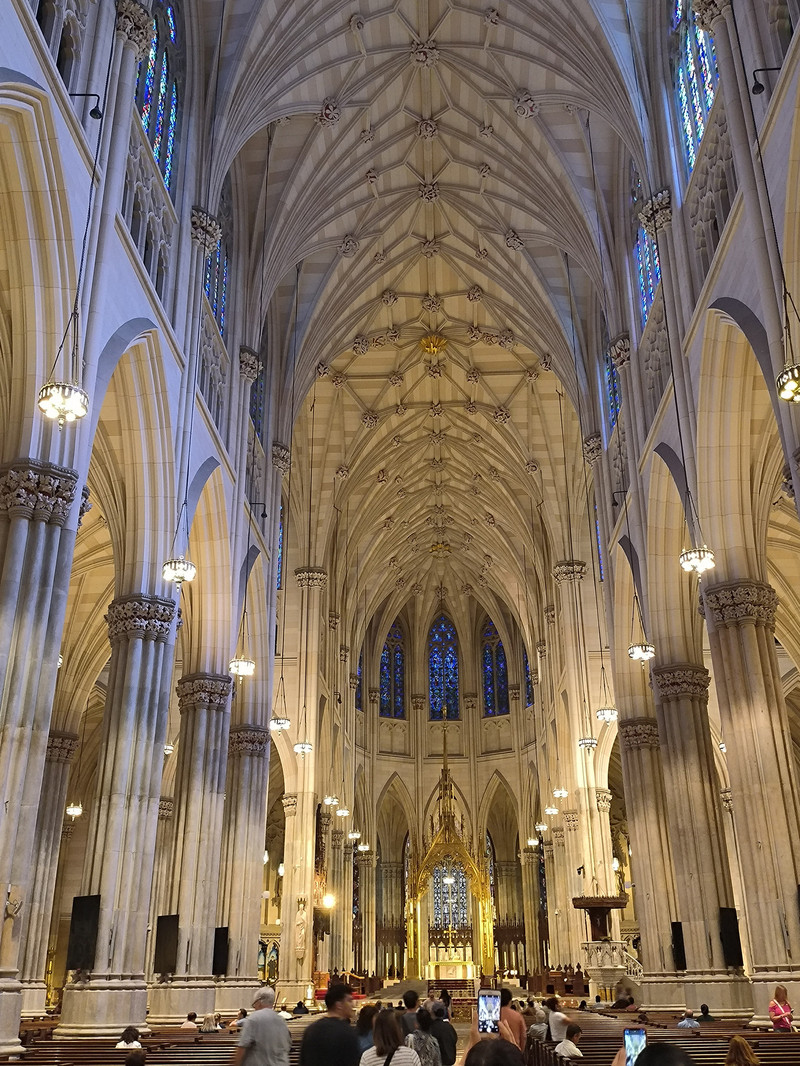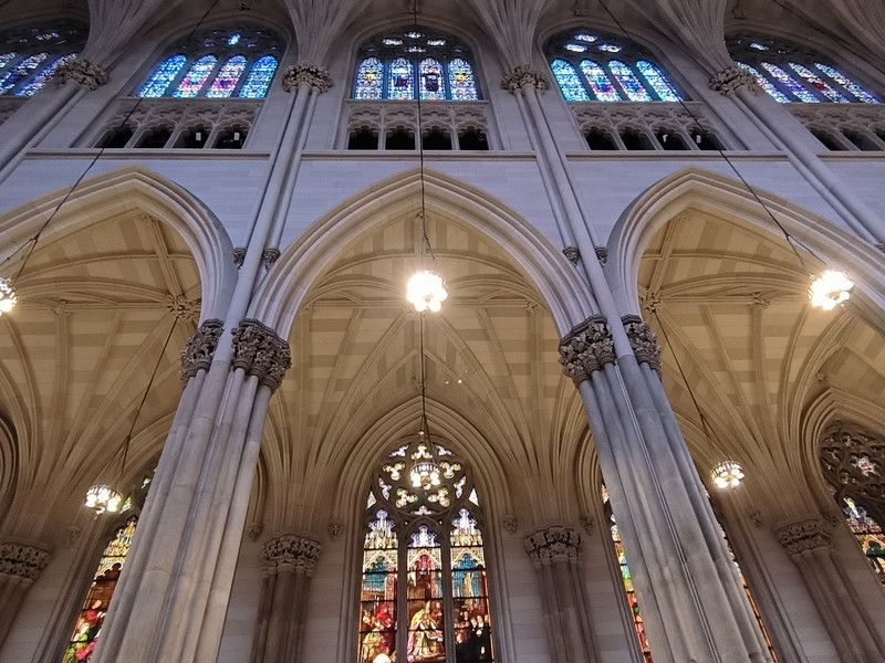 第五大道上也有多座教堂,其中圣帕特里克大教堂是纽约市乃至全美的标志性天主教堂,外型仿德国科隆大教堂设计,1888年建成,哥特式建筑风格,高达100米,为纽约最大天主教堂,外部装饰华丽,内部空间宏大,拥有长100余米纵深,彩绘玻璃窗和雕刻天花板工艺精湛。