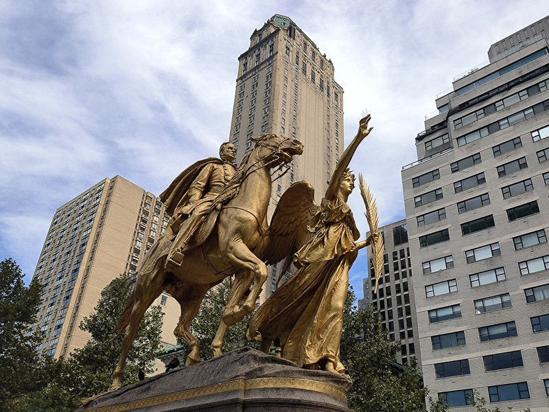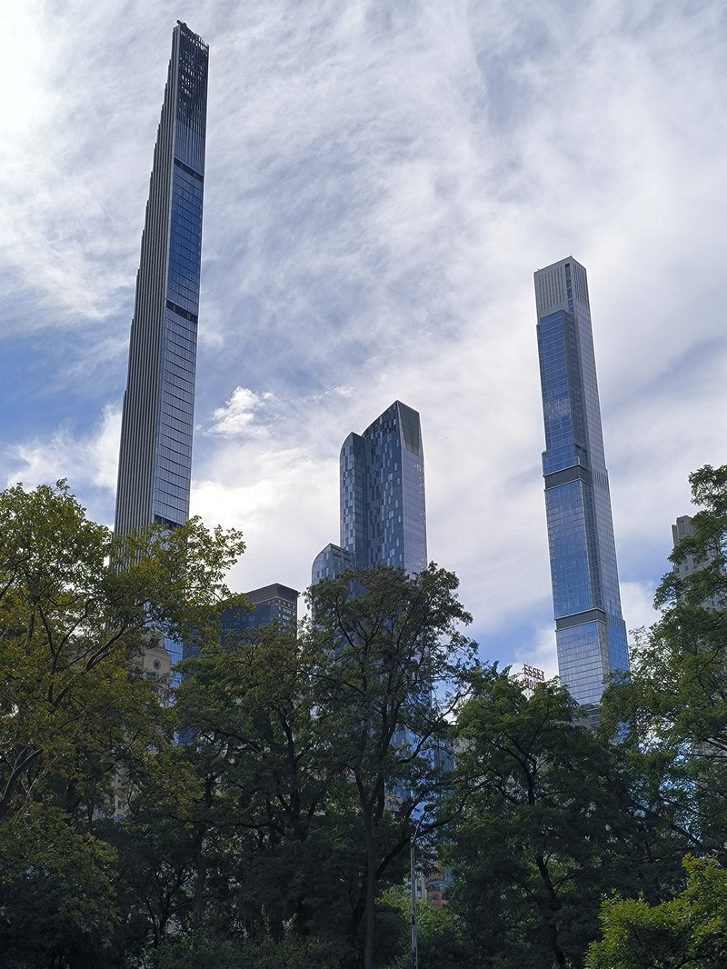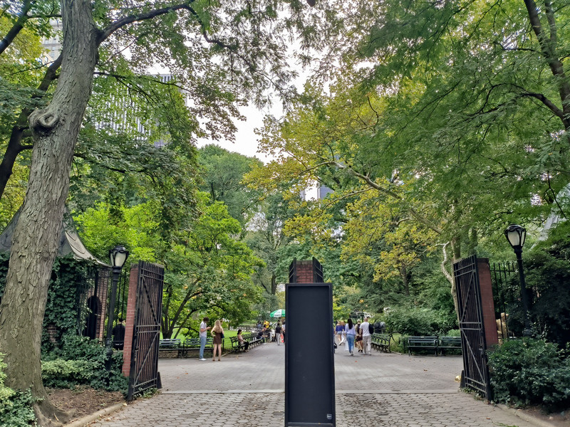 第五大道的北端终点就是中央公园,占地面积约 340公顷 ,长跨 51 个街区,宽跨 3 个街区,是纽约最大的都市公园,南门有一座金色塑像,园内松鼠自由嬉戏,园外高楼细如竹笋,我们走在其中感觉并不明显,但从高空航拍图片看中央公园则如一块绿色宝石,周围全是密密麻麻的高楼大厦。