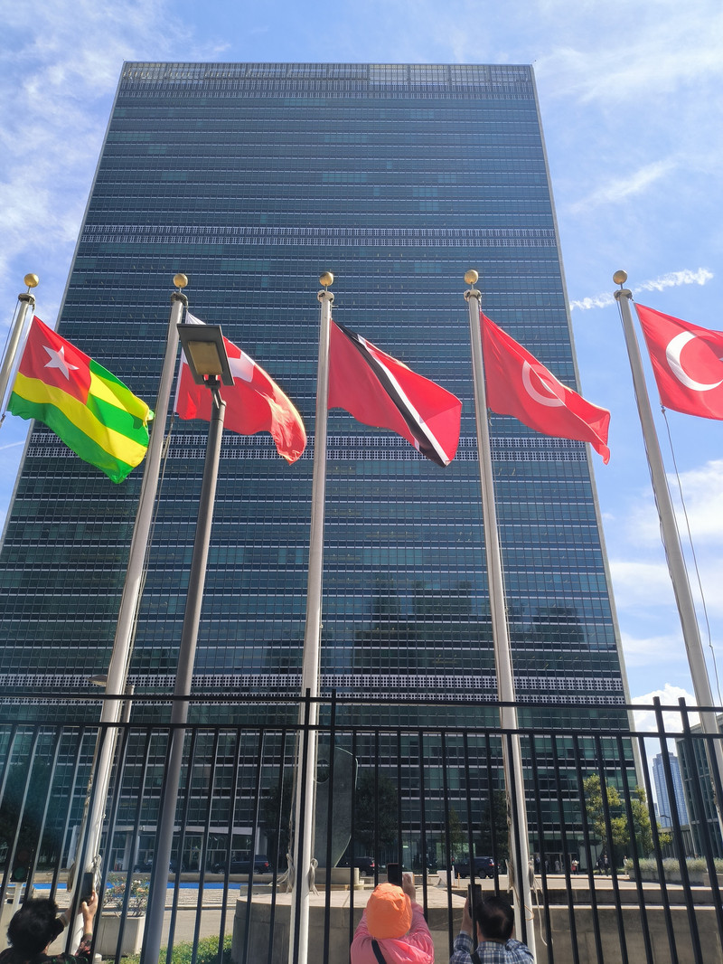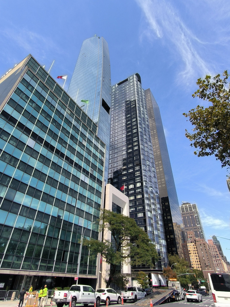 离开华尔街来到东河畔的联合国总部大厦,联合国总部建于1949—1951年,包括秘书处大楼、会议厅大楼、大会厅和哈马舍尔德图书馆4栋建筑,其中秘书处大楼位于中心位置,是联合国总部的核心建筑,39层高154米,是早期板式高层建筑之一,也是最早采用玻璃幕墙的建筑,大楼前方树立着190多个联合国成员国的国旗。