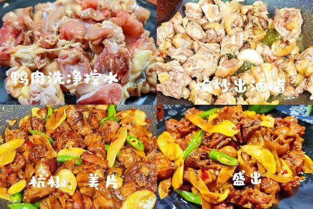 1. 鸭肉切块焯水,仔姜切片,青红椒切段备用;