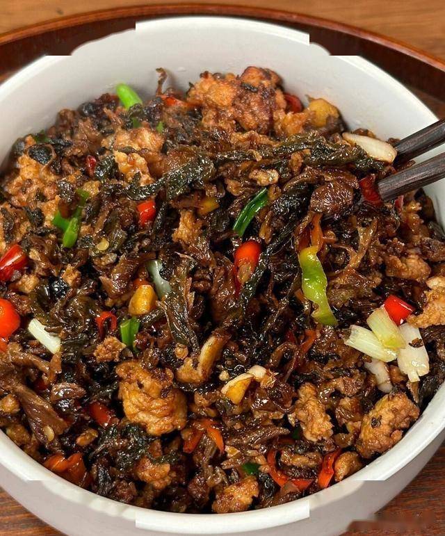 1. 梅干菜挤干水分切碎,小火煸炒至干香盛出。