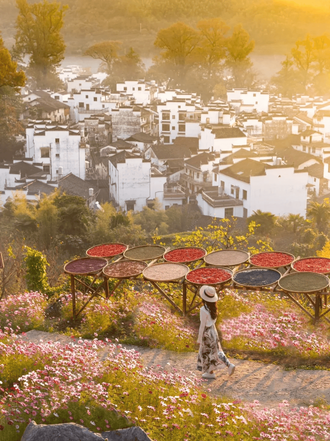 核心元素:徽派建筑群(马头墙、天井院落)、梯田、晒秋民俗(篁岭的辣椒、谷物)、小桥流水。