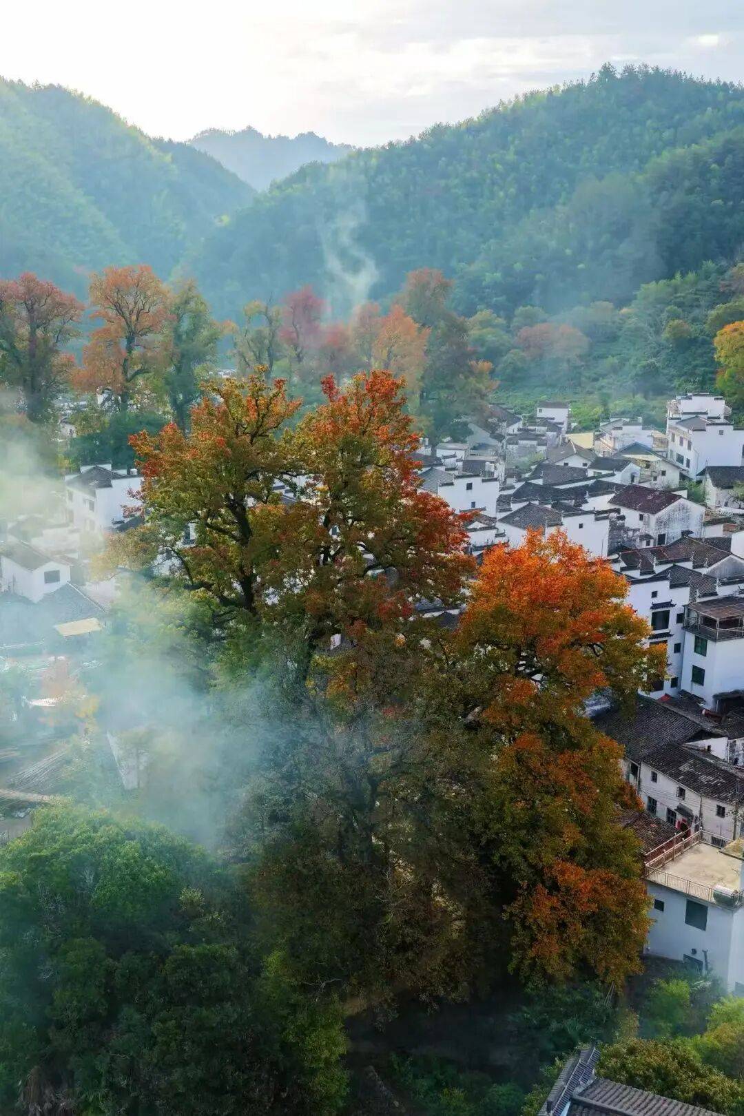 核心元素:百年红枫(树龄最高达700余年)、晨雾炊烟、徽派建筑(粉墙黛瓦)、丁达尔光效应。