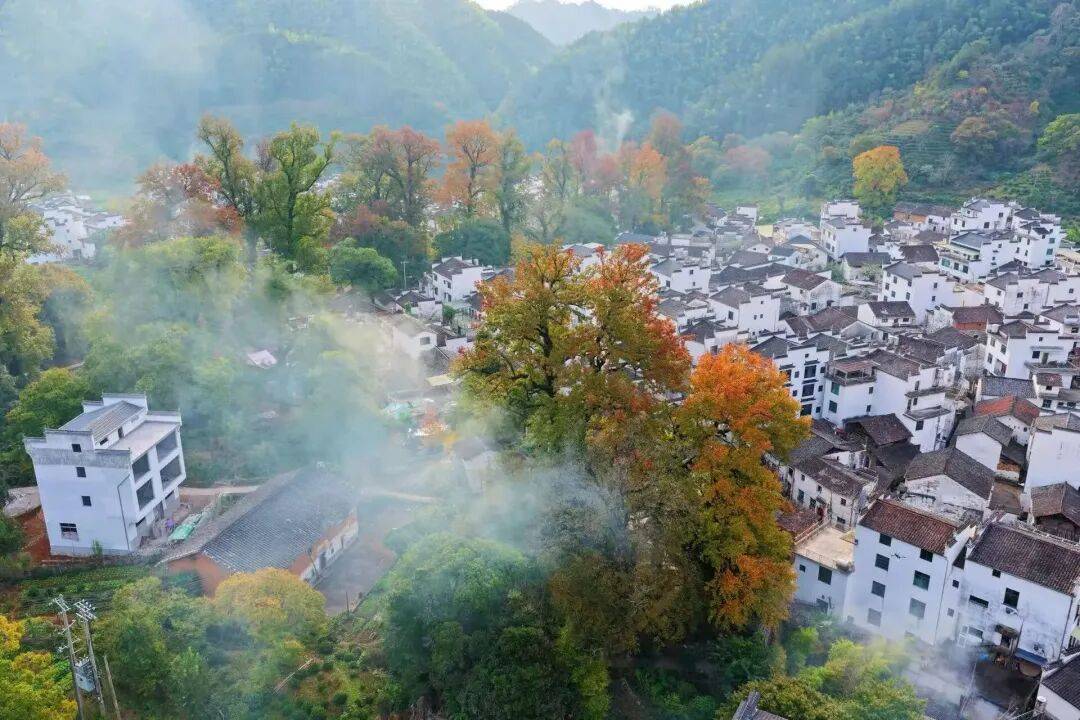 村内黄杨、乌桕等树木同步变色,红、橙、黄多层次色彩铺满山谷,宛如天然调色盘。