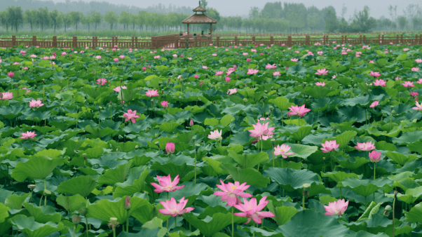 告别夏日的燥热,初秋的荷塘迎来荷花残韵与睡莲绽放,还有大片百日菊点缀,呈现“绿中带粉、粉中带黄”的层次感;