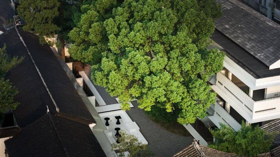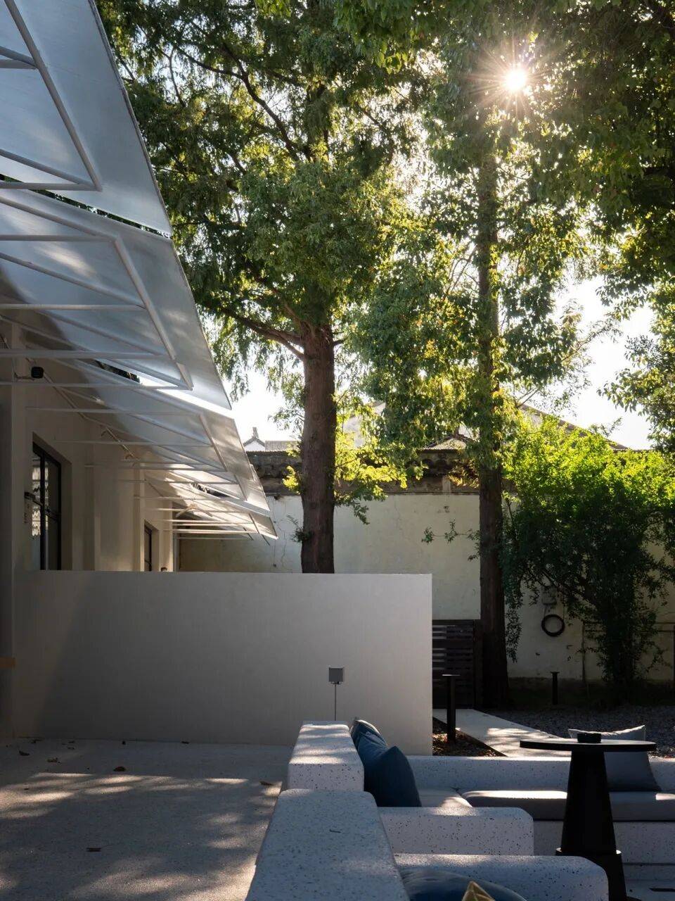 翻新后的建筑是古城区的主色调白色,配以白透的阳光板檐口。主庭院是灰白色水洗石,建筑和庭院共同形成一个白色纯净的中间层次。