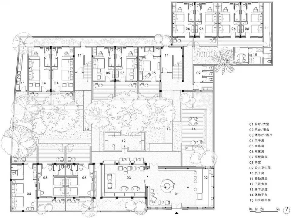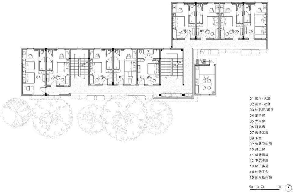 场地的核心气质是迷人的林下光影。我们通过空间组织和材料过渡,让这片美妙的阴翳树影更好的渗透进酒店各个空间。走廊侧有客房挡雨的需求,就在走廊和树林之间设置了一层错落叠合的阳光板构筑,挡雨的同时让光线经过材质过滤幻化出不同的形态。