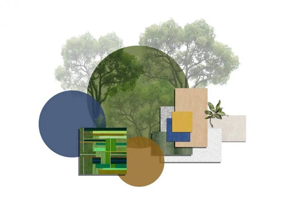 到了室内,我们使用了原木色海洋板和暖色涂料作为温暖的背景。主色采用了松绿、灰蓝、土黄这三个绿色友好色。局部的家具和软装我们选用了更为热烈饱满的色彩,如克莱因蓝,明黄,粉红等点缀其中。多种色彩在绿色的包裹下显得生动和谐。