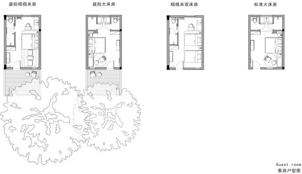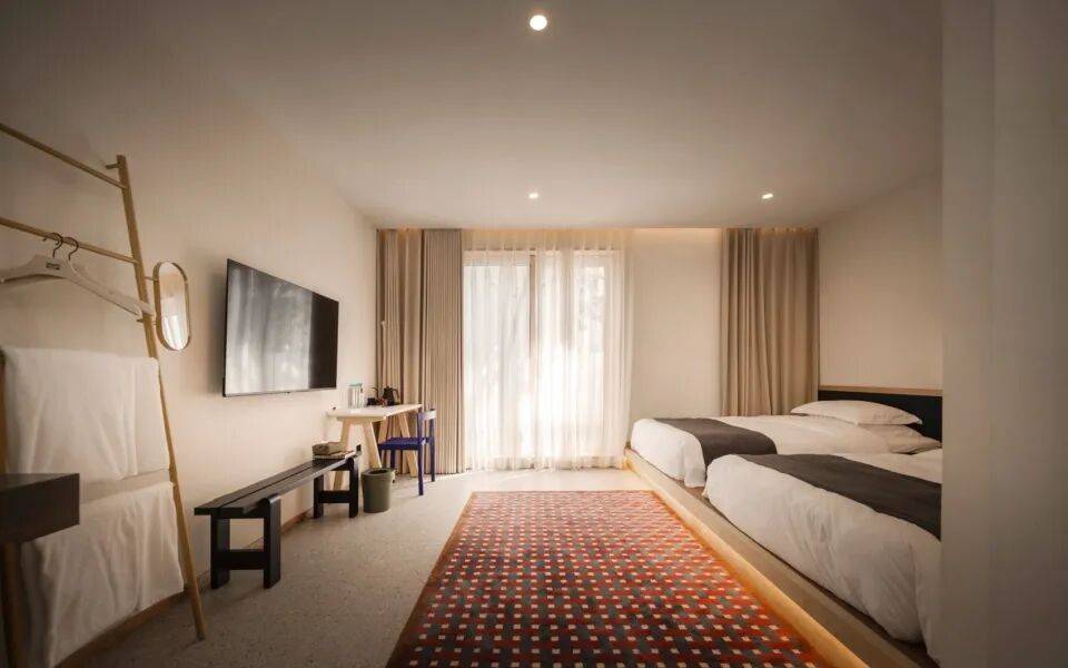 建筑原本的格局基本限定了30间客房的大体布置。我们和酒管方仔细研究了酒店定位下客户群体的需求,并根据各个房间位置和空间特点,设置了阁楼套房、庭院房、榻榻米房、宠物友好房等九种房型。在平均二十多平米的客房空间内,也分出了客厅休闲区,睡眠区,三分离卫浴区的布局。房间内因为原有格局采光有限,朝南对着树林,通过海洋板窗套和双层纱帘的组合,勾勒出朦胧光感的透景画框。北向面对居民区则是蜂窝帘的见光不见形,保证隐私又充满光线。家具联合时尚家居品牌,结合空间特质做了一些定制款的家具,很好的活跃了房间氛围。