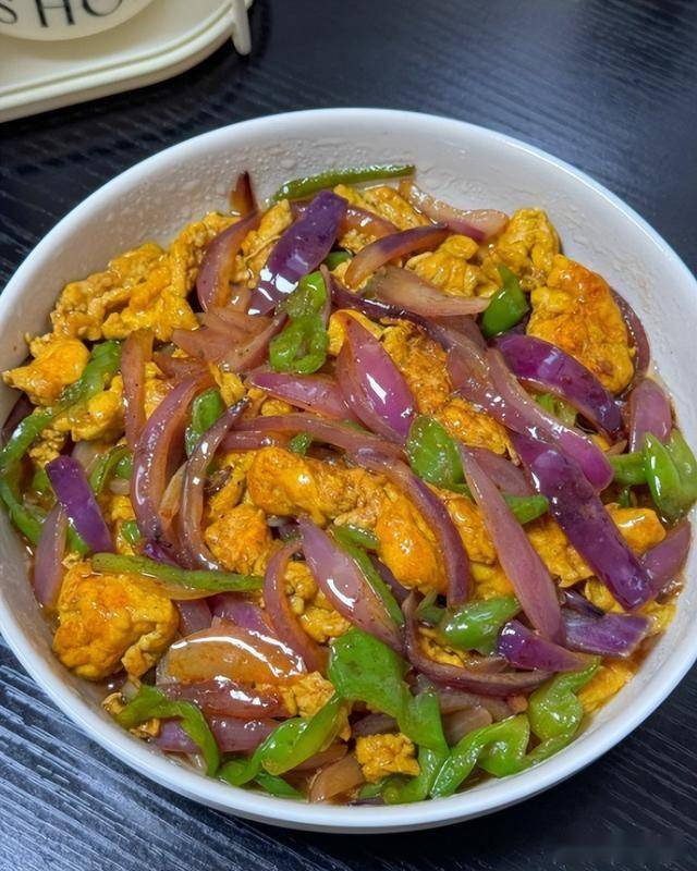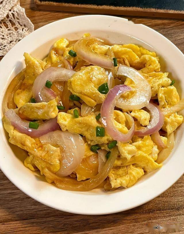 6. 放入炒好的鸡蛋块,与洋葱丝一起翻炒,让鸡蛋和洋葱充分融合。
