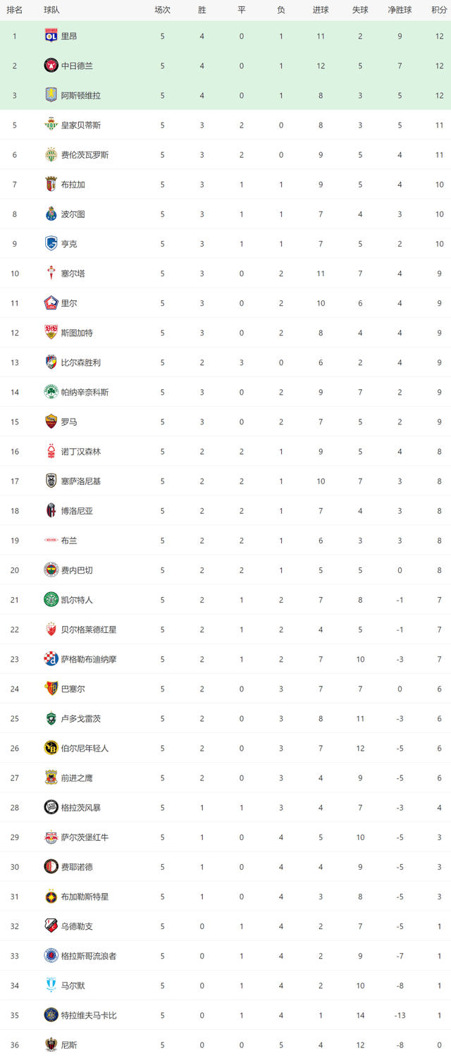 前5轮踢完,维拉4胜1负拿到12分,目前排名第三,他们和榜首的里昂,只有4个净胜球的差距。最后3轮比赛,维拉随时能反超对手,以头名的身份晋级16强。