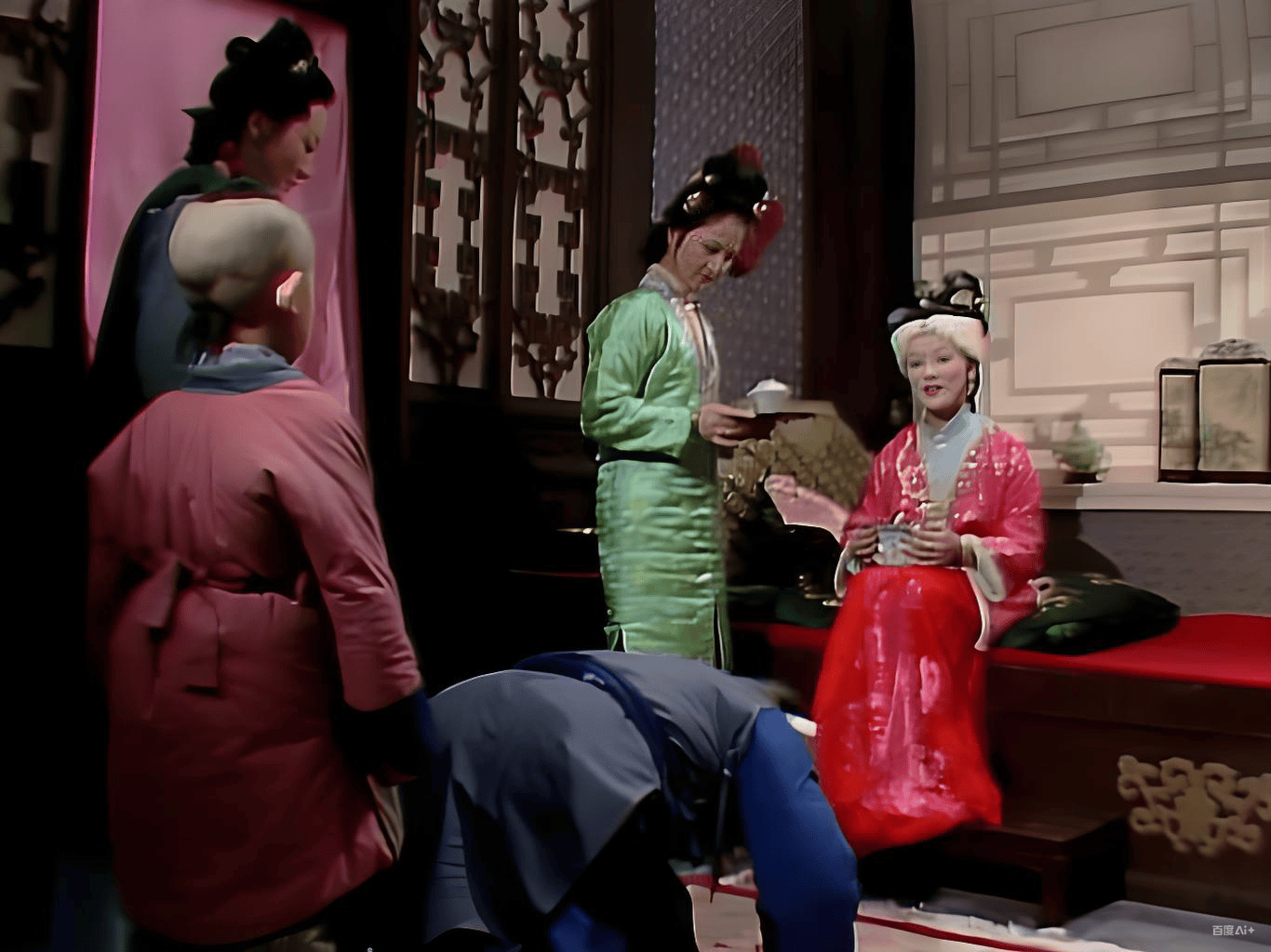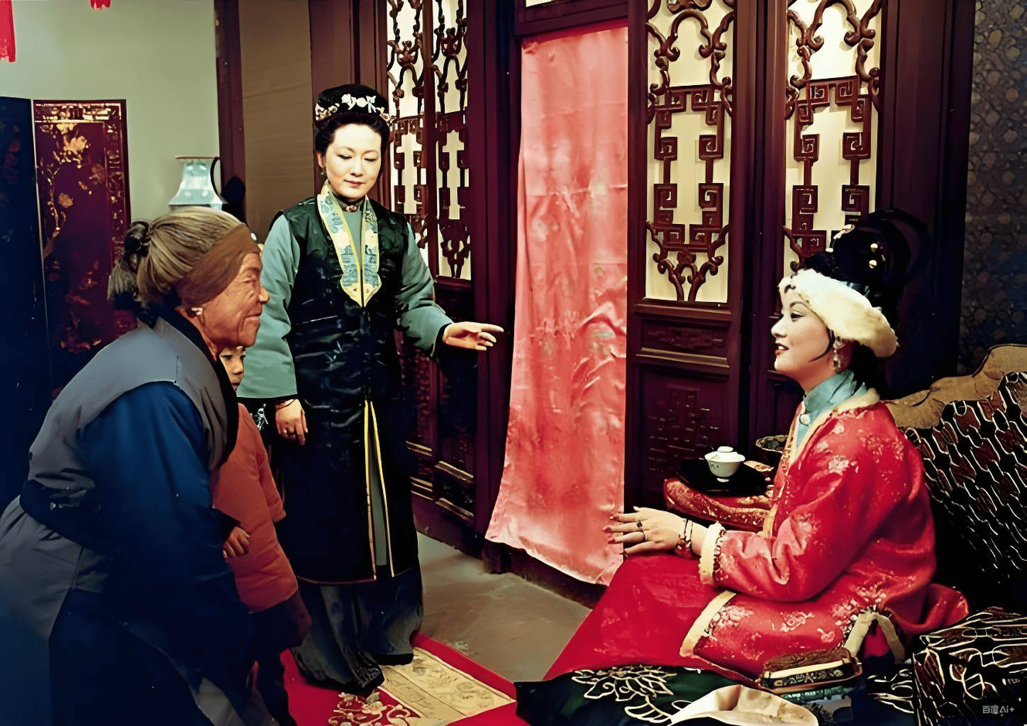 裙装采用“大红”这一正色,与桃红袄子形成同色系呼应,层次丰富,进一步强化了她作为管家奶奶的权威与气场。