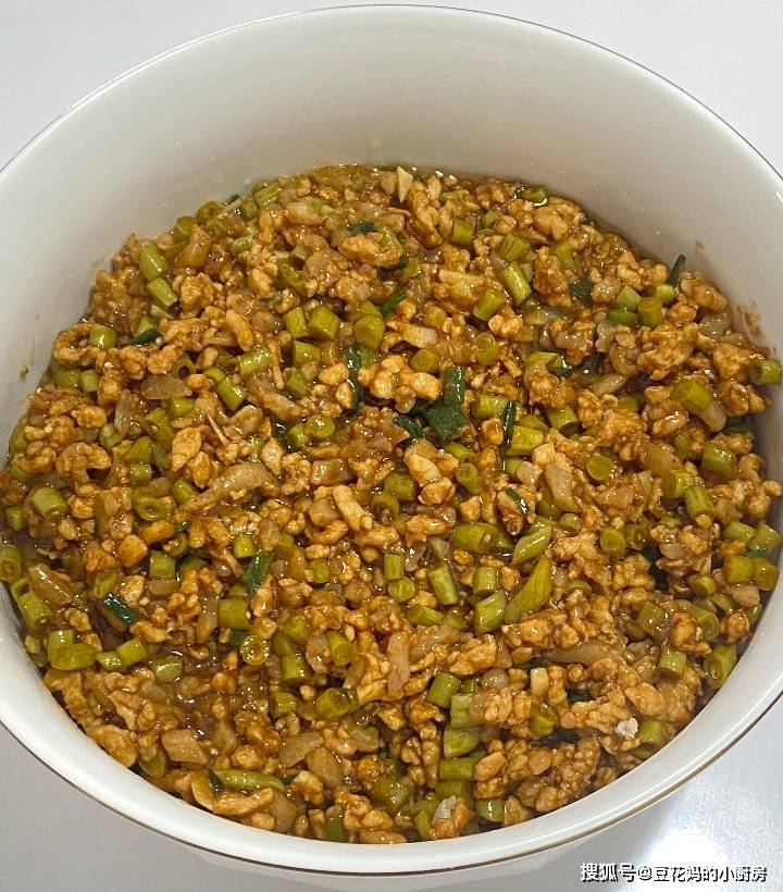 【做法】酸豆角用清水冲洗一遍,挤干水分,切成碎末(太咸可多冲几遍);小米辣切圈。猪肉末中加葱姜末、料酒、生抽、蚝油、盐、白糖,顺着一个方向搅拌均匀,加淀粉拌匀。热锅放 1 勺食用油,下小米辣圈爆香,加入酸豆角碎翻炒 1 分钟,放凉后倒入肉馅中,搅拌均匀(酸辣开胃,包包子、饺子都下饭,馄饨也超香)。