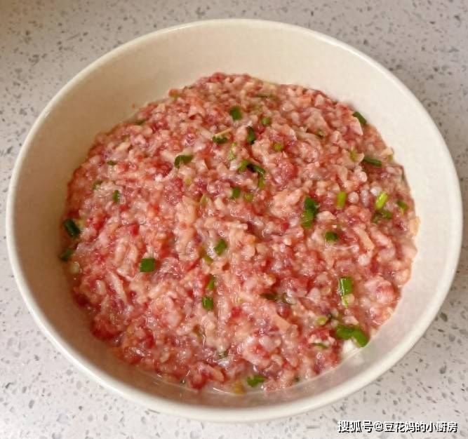 食材:猪肉末500g、洋葱1个(切碎挤水)、葱姜末各15g。