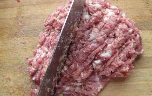 这里还要提醒大家一点,不要为了偷懒去选择用机器把肉搅碎,因为用机器搅出的肉馅口感不好,所以一定要自己来剁肉馅,手工剁出来的肉馅会筋道很多,剁好肉馅后就可以开始拌肉馅了。