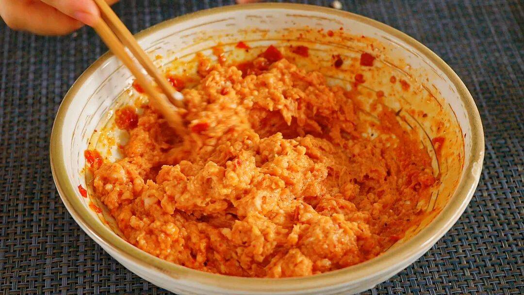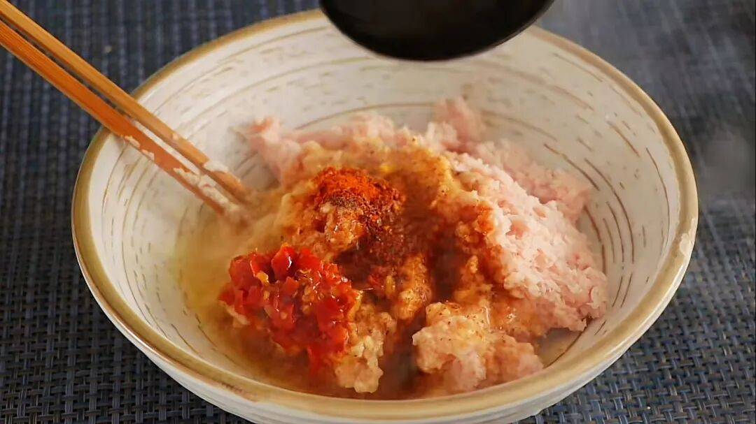 同样前一晚准备肉馅:1 斤带颗粒的猪前腿肉末中,加 1 勺生抽、适量盐、1 勺花椒粉、2 勺辣椒粉、1 勺剁椒,最后浇 1 勺热油,激发出香料的香味,充分搅拌均匀,静置入味即可。