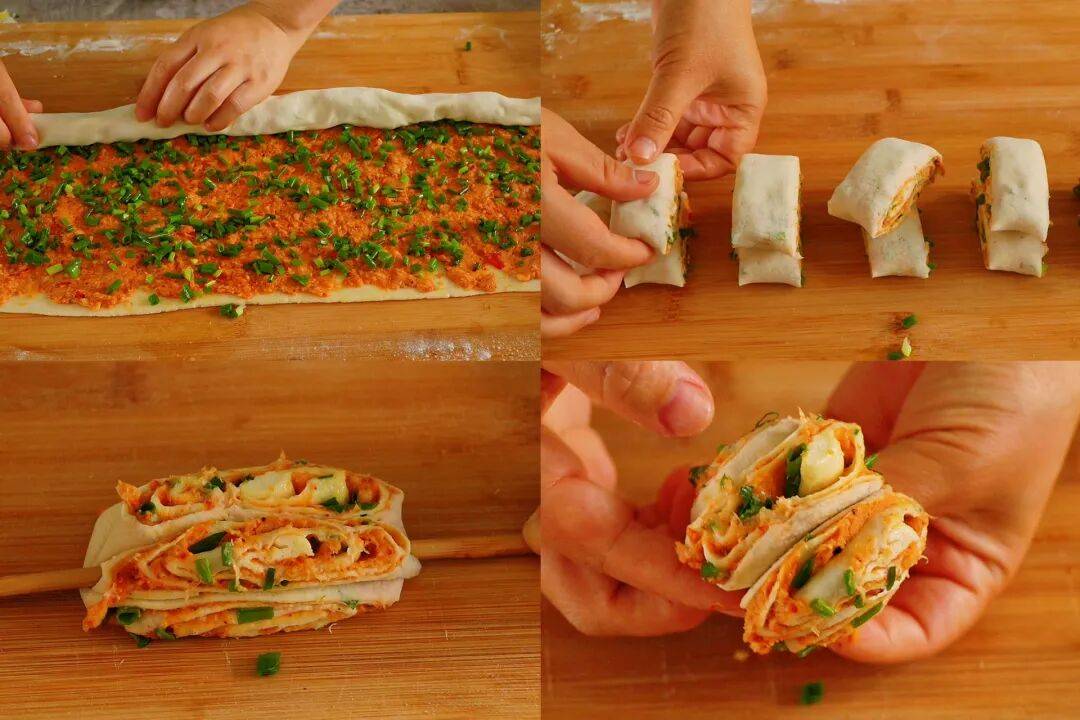 刚出锅的肉末花卷,红彤彤的肉馅裹着翠绿葱花,光看着就超有食欲!咬一口外软内香,带颗粒的肉末鲜香入味,微辣不腻,松软还多层,我自己一口气能吃 4 个~ 不辣的小个头版本,孩子也超爱,边吃边喊 “妈妈做的比买的好吃”!