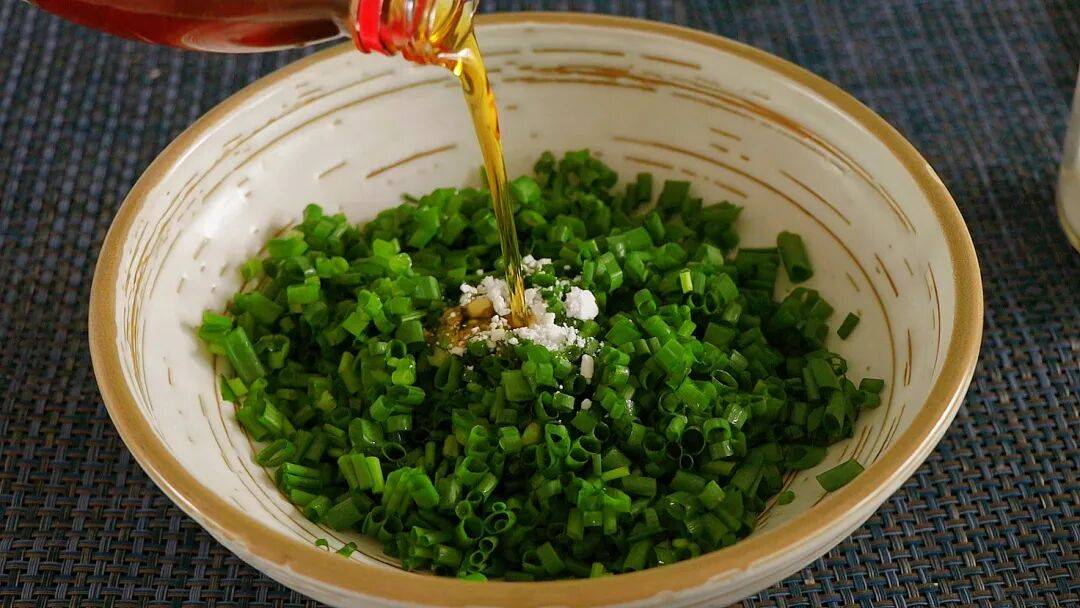 小葱洗净切碎,加 1 小勺食用碱和少许香油,搅拌均匀 —— 这样蒸好的葱花会保持翠绿,颜值更高;没有食用碱也可以省略,只是葱花会微微发黄,不影响口感。