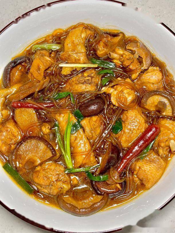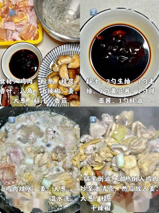 1. 干榛蘑用温水泡发,洗净泥沙;土鸡切块焯水去血沫;粉条泡软备用。