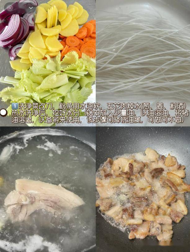 1. 五花肉切薄片,白菜洗净切块,土豆、胡萝卜去皮切滚刀块,粉条用温水泡软。