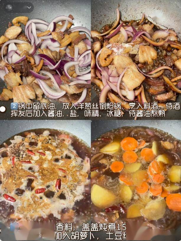 3. 加入土豆和胡萝卜块翻炒均匀,淋入生抽和老抽调味上色。