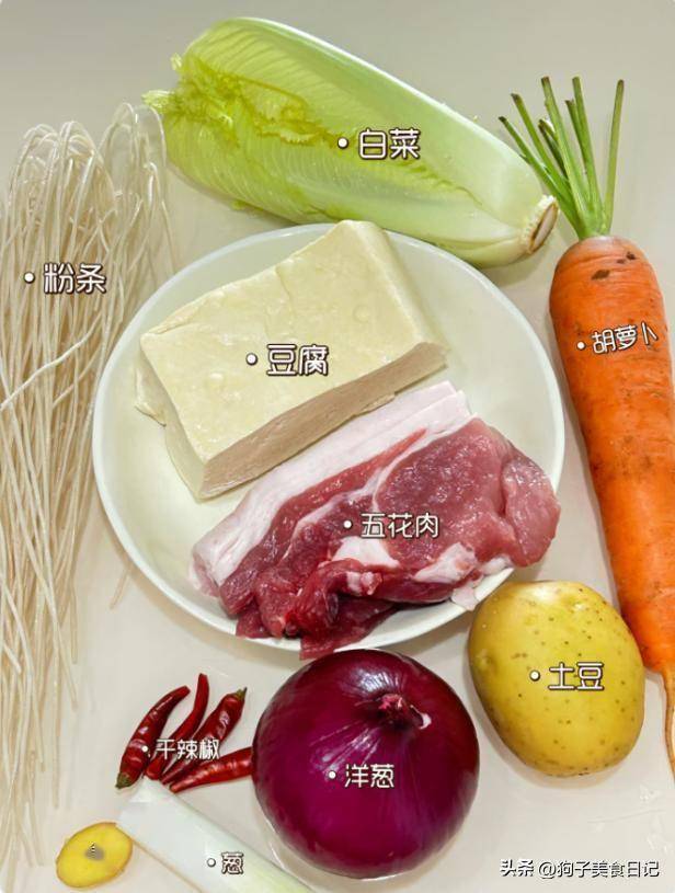 - 主料:五花肉200克、白菜半棵、土豆2个、胡萝卜1根、粉条1把