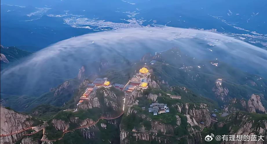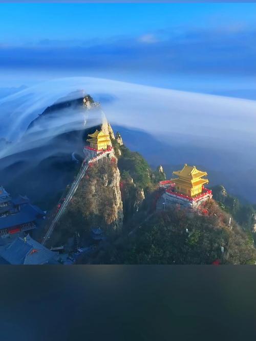 第一张图,这张图展现的是河南洛阳老君山的标志性奇观:画面里是老君山金顶区域的道教建筑群(包含老君庙、玉皇顶等殿宇),它们依着伏牛山主峰的险峻崖壁而建,红墙灰瓦搭配鎏金殿顶,在山间大面积的 “云瀑”(云海如丝带般萦绕)包裹下,既有险峰建筑的壮阔,又带着道教圣地的空灵仙气。